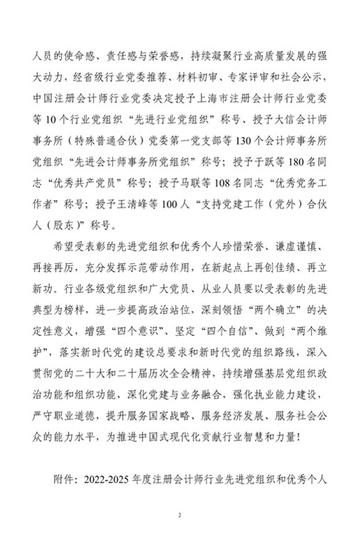 近日,收到中共中國注冊會計師行業(yè)委員會文件《關(guān)于表彰2022-2025年度注冊會計師行業(yè)先進黨組織和優(yōu)秀個人的決定》,我所主任會計師吳林海同志榮獲注冊會計師行業(yè)“優(yōu)秀黨務(wù)工作者”稱號。 此次榮獲“優(yōu)秀黨務(wù)工作者”稱號,不僅是對其個人工作的認可,也是對我所黨建工作的高度肯定。 我所將以此次獲獎為契機,進一步加強黨建工作,深化黨建與業(yè)務(wù)融合,提升服務(wù)質(zhì)量,堅守職業(yè)道德,不斷增強服務(wù)國家戰(zhàn)略、服務(wù)經(jīng)濟發(fā)展、服務(wù)社會公眾的能力。 附件: